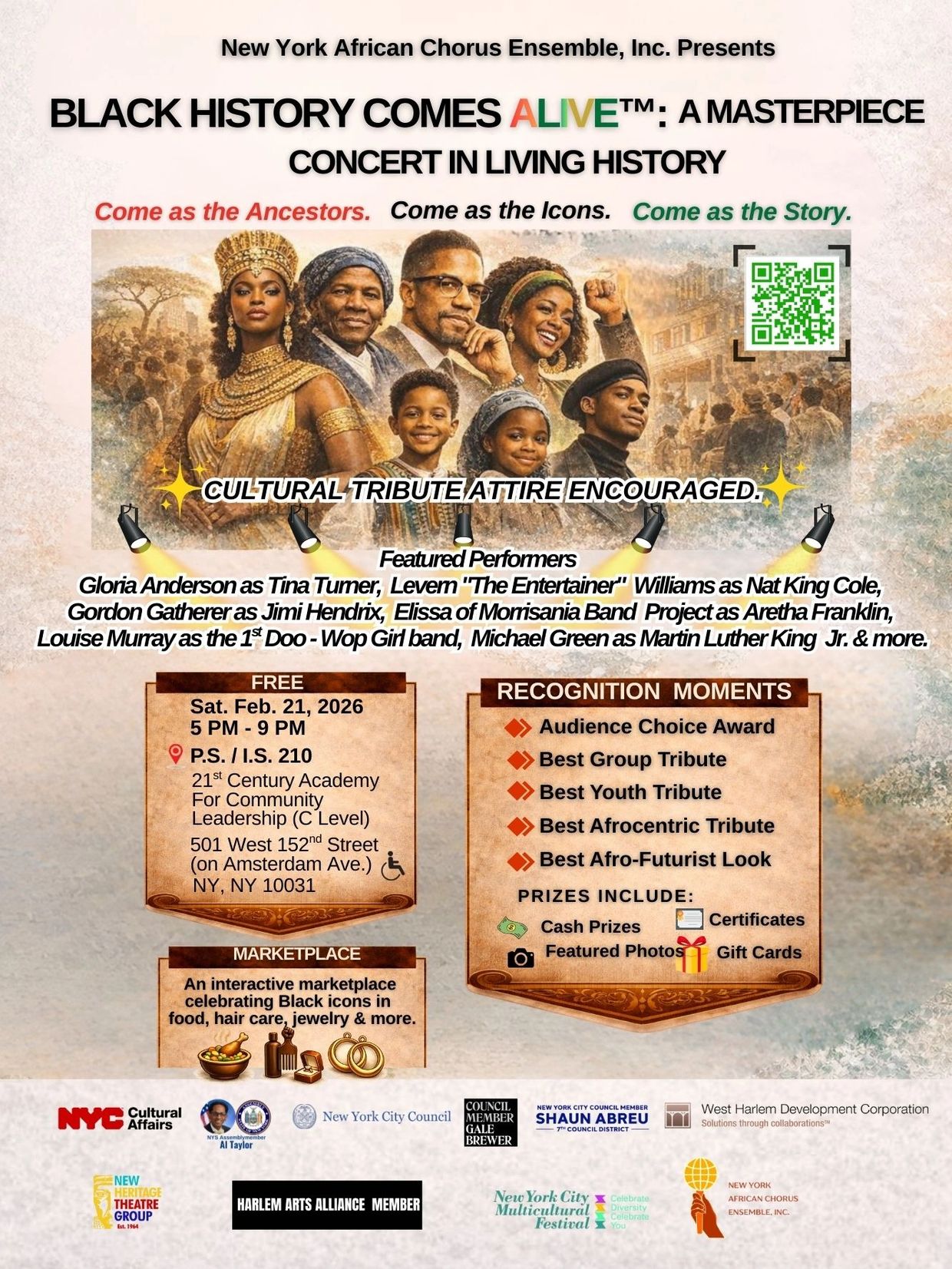BLACK HISTORY COMES ALIVE™ is a groundbreaking Black History Month concert that turns traditional performance into a living museum of Black history. This concert invites both performers and audience members to arrive in Cultural Tribute Attire honoring Black historical figures, cultural icons, movements, and ancestral legacies. Rather than observing history from a distance, participants become history, walking, singing, dancing, and gathering as living embodiments of Black excellence across centuries and continents.